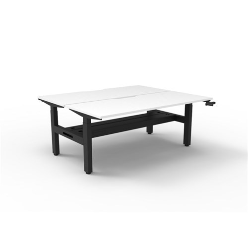 • Rapidline Boost back to back 2 person manual crank height adjustable workstation with cable tray. White top with black frame.