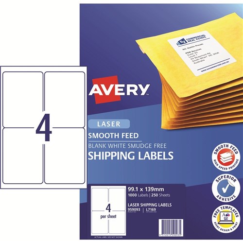 Avery Laser Shipping Labels White L7169 99.1x139mm 4UP 1000 Labels 250 Sheets