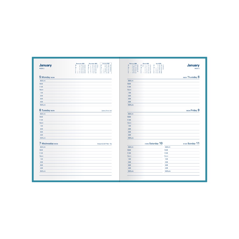 • Bound in durable PVC with soft flexible cover. Printed on white paper, week numbers, Julian days, Australian and New Zealand holidays.