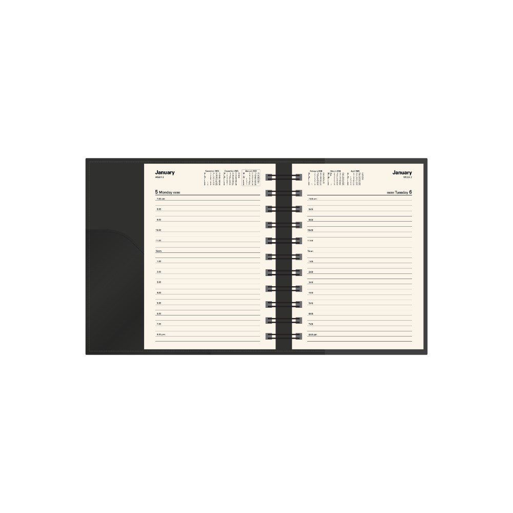 • Printed on a subtle cream paper, each dated page layout features a six-month to opening calendar, week numbers, Julian days, as well as both national and international public holidays.