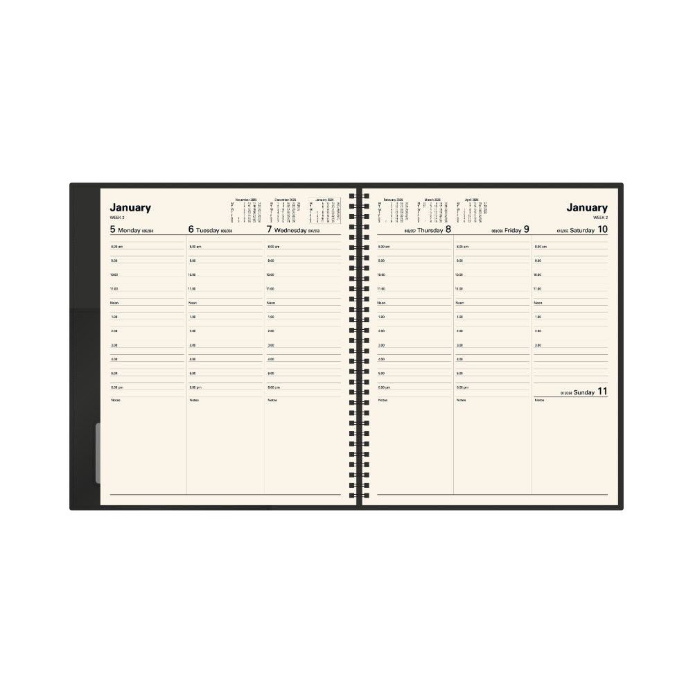 • Pen loop, lay flat opening, ribbon marker, vertical week to view layout.