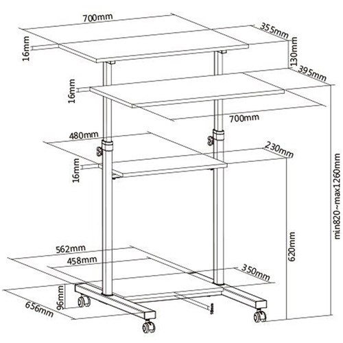 Ergovida Mobile Computer Desk 3 Shelf 700W x 355D x 820-1260mmH Silver/Black