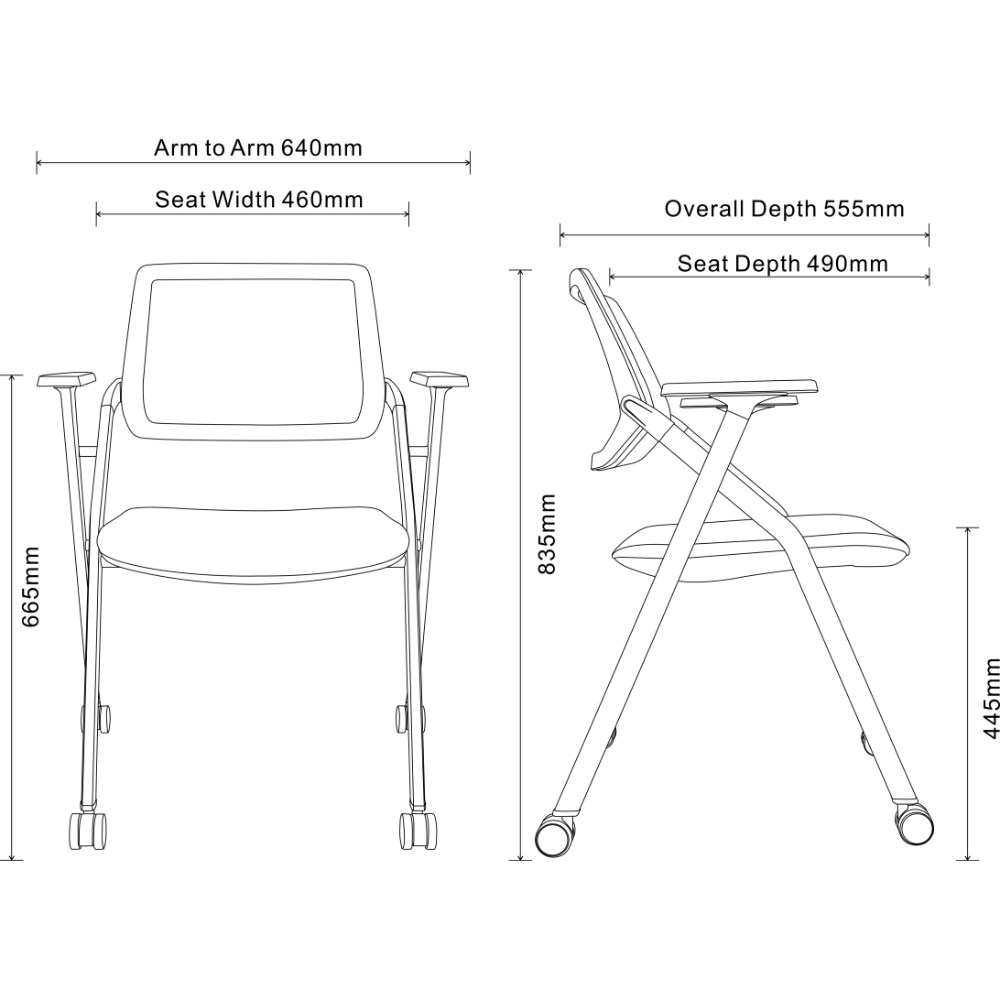 • Arm To Arm: 640mm. Floor To Top Of Arm: 665mm. Overall Height: 835mm. Overall Depth: 555mm.