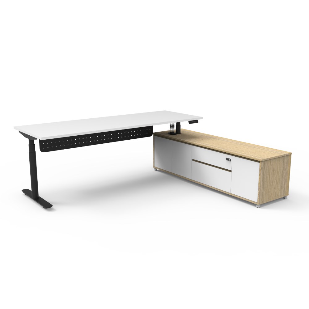 Rapidline Halo+ Executive Desk + RHS Cabinet + Panel 2270W x 1936D x 620-1270mmH White/Blk