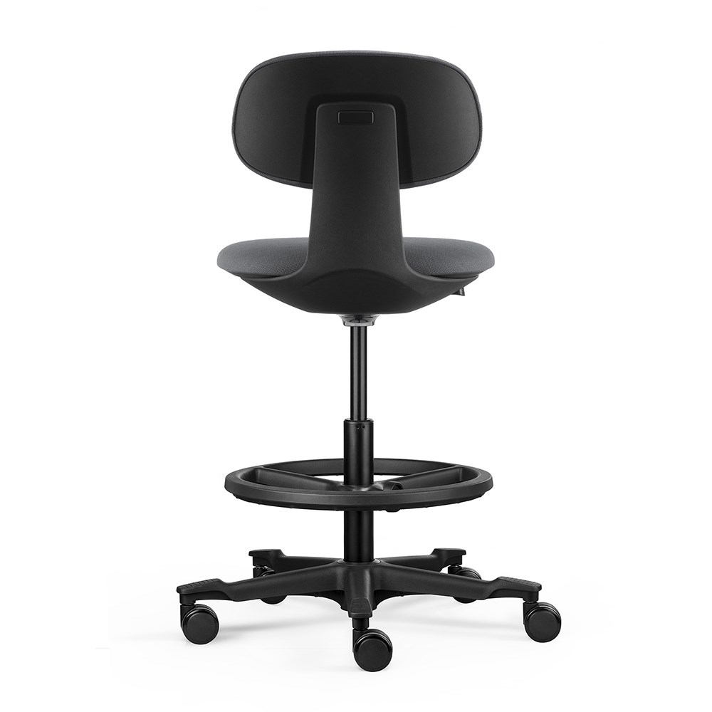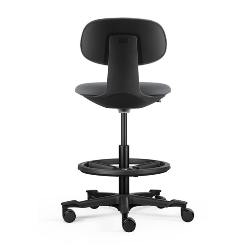• A height-adjustable sit-stand chair. The moulded foam seat and back and the nylon base with castors ensure user comfort and easy mobility.