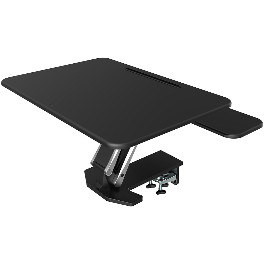 • Attaches to the front edge of any surface and provides a one handle easy adjustable sit stand work surface.