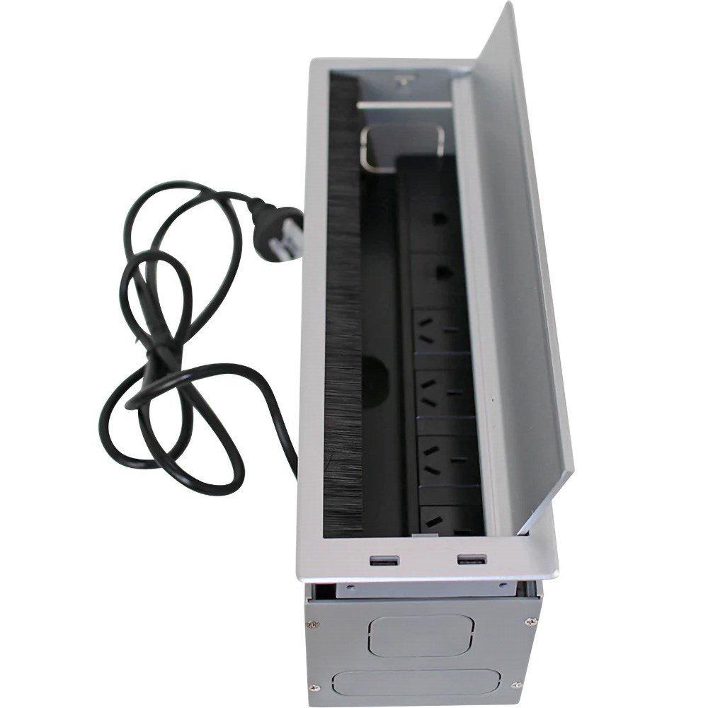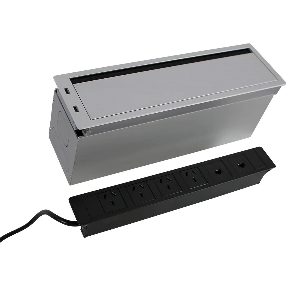• Embedded into the desk to keep the top access to the?power board?flush?with the table surface. When not in use, the lid?closes?to?conceal the?power board.?.