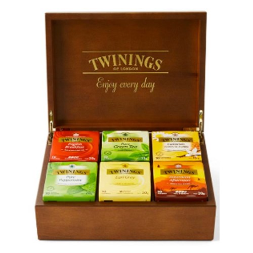• 6 compartments contains a combination of teas in a uniquely crafted wooden box including: English Breakfast, Pure Peppermint, Pure Green, Earl Grey, Camomile Honey and Australian Afternoon tea.