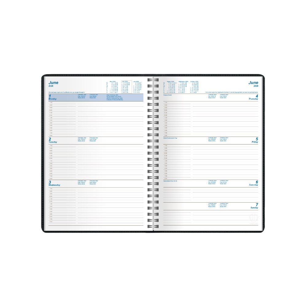 • Featuring a padded, phthalate free, PVC cover, pockets for storing business cards and wire-o binding to allow the diary to lie completely flat when open.